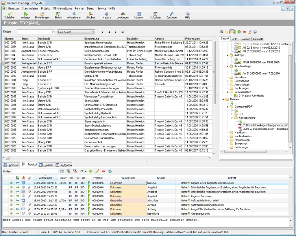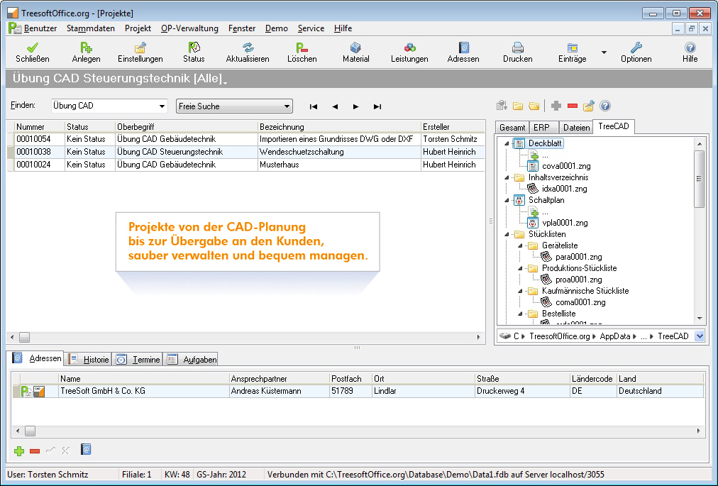 Mit der Treesoft Projektverwaltung lassen sich kleine und große Projekte, sowie Vorgänge verwalten. Lege Projekte mit unterschiedlichen Oberbegriffen an und definiere deine Projekte über eine Projektdeklaration. Einem Projekt lassen sich unterschiedliche Adressen und Kontakte sowie Protokolleinträge zuordnen.