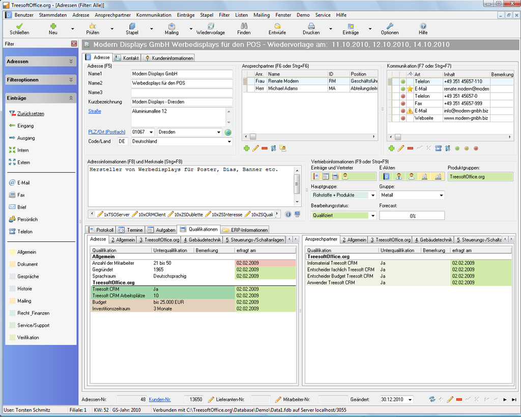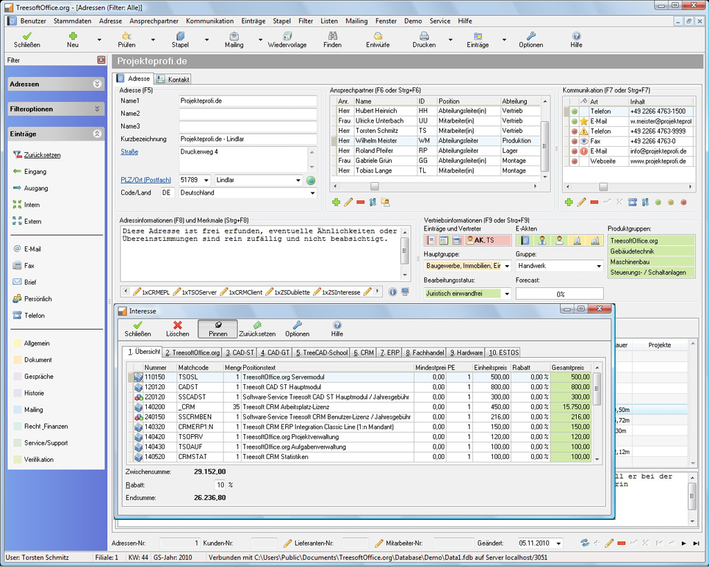 Professionelles Adressen- und Kontaktmanagement zur Verwaltung von Interessenten, Kunden, Lieferanten, Hersteller und Mitarbeiter mit beliebig vielen Ansprechpartnern und Kommunikationsdaten.