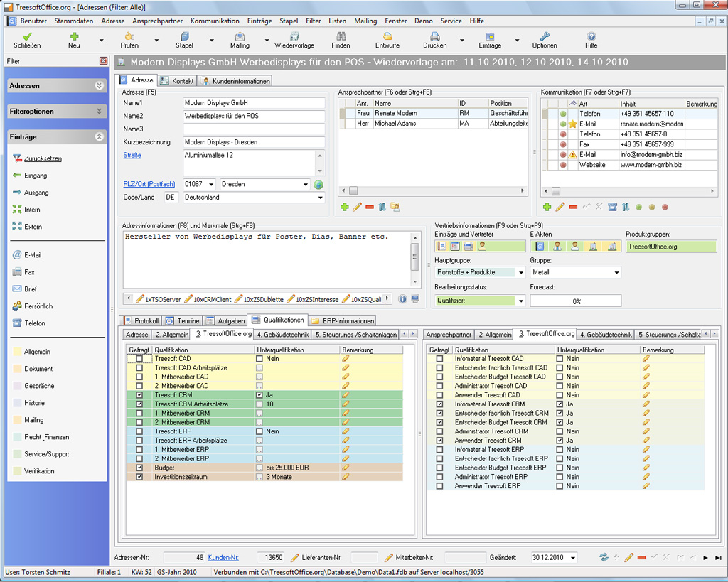 Mit den Treesoft Qualifikationen lassen sich beliebige zusätzliche Informationen zu den Adressen und Ansprechpartner hinterlegen. Diese Informationen sind automatisch sofort auswertbar und werden auf einer entsprechenden Übersichtsseite so dargestellt, dass nur die eingetragenen Informationen angezeigt werden.