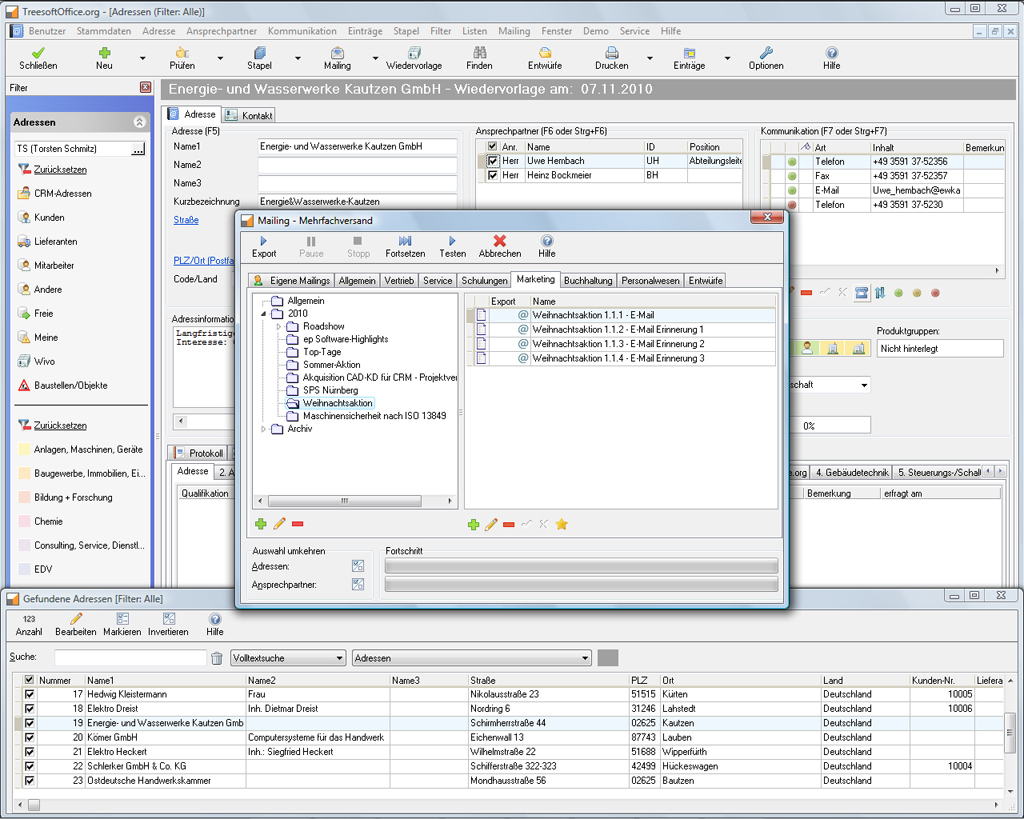 Mit dem Treesoft Serienbrief- und Kampagnenmanagement lassen sich gespeicherte E-Mails, Telefaxe und Briefe als Mailings an einen oder mehrere Empfänger versenden.