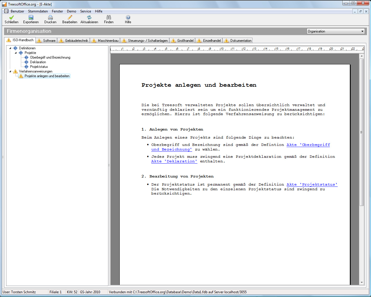 Die Treesoft E-Akte bietet mehrere in Treesoft CRM integrierte, elektronische Aktenordner. Hierdurch lassen sich Aktenordner zu Adressen, Ansprechpartner, Anwendern anlegen. Sogar Anwender übergreifende Aktenordner sind möglich. Hierdurch lassen sich zum Beispiel Firmen interne Definitionen oder Verfahrensanweisungen zentral hinterlegen. Sogar das Hinterlegen von DIN EN ISO Handbüchern und die Lenkung von Dokumenten werden drastisch vereinfacht.