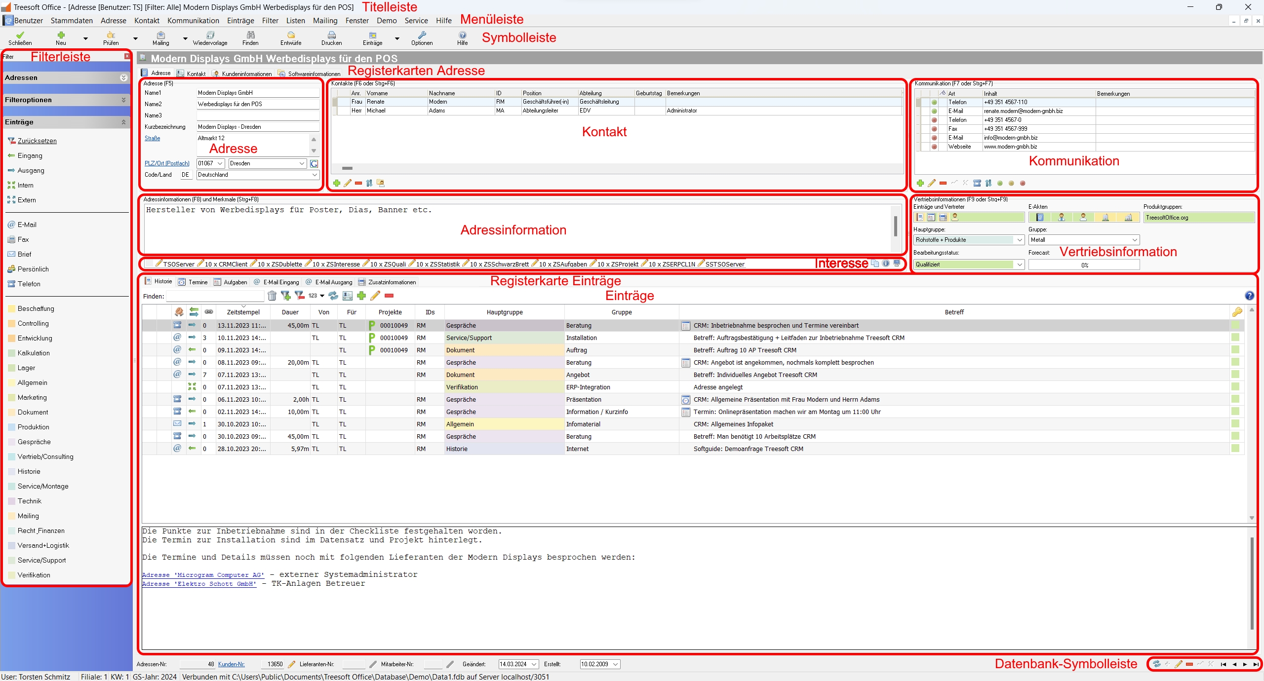Treesoft CRM ist eine auf Adressen basierende Software zur Adressverwaltung. Mittels Registerkarten können Kunden-, Lieferanten-, Hersteller- und Mitarbeiter-Informationen hinzugefügt werden. Die Adresse muss nur einmal angelegt werden, das spart Zeit und macht das Ganze noch übersichtlicher.