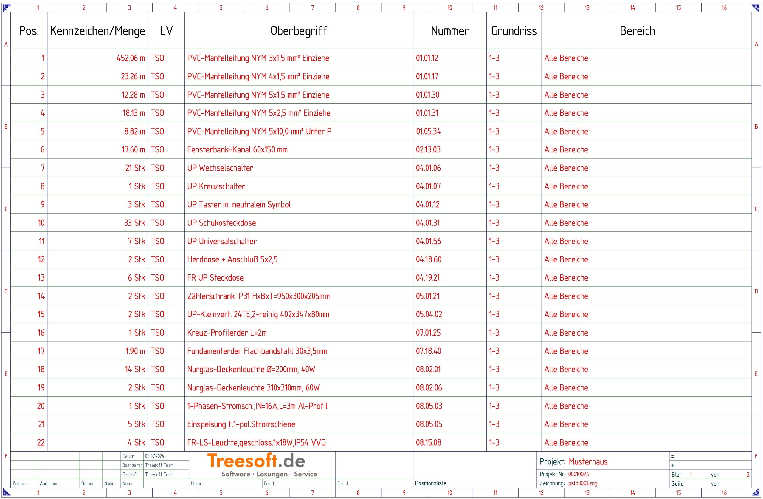 - Automatische Auswertungsfunktionen zur Erstellung von Stücklisten (Massenermittlung), Stromkreislisten, Verbindungslisten und Typenlisten mit direkter Druckausgabe