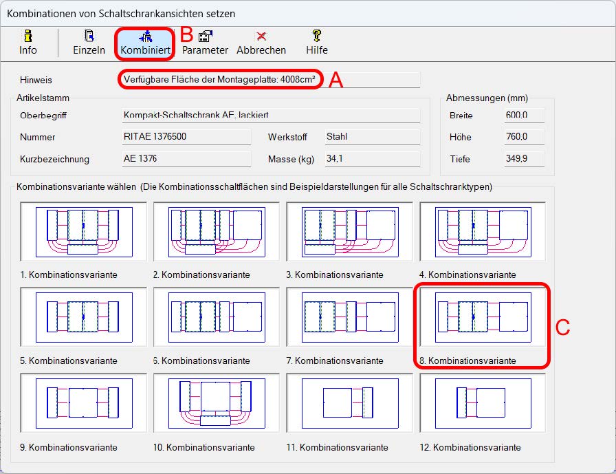 Nach der Auswahl des Schaltschrankes aus einem Hersteller-/Lieferantenkatalog öffnet sich der Dialog Schaltschrankansicht setzen. Jetzt kannst du wählen, ob beispielsweise nur die Montageplatte gesetzt werden soll oder ob du eine kombinierte Schaltschrankansicht setzen willst.
