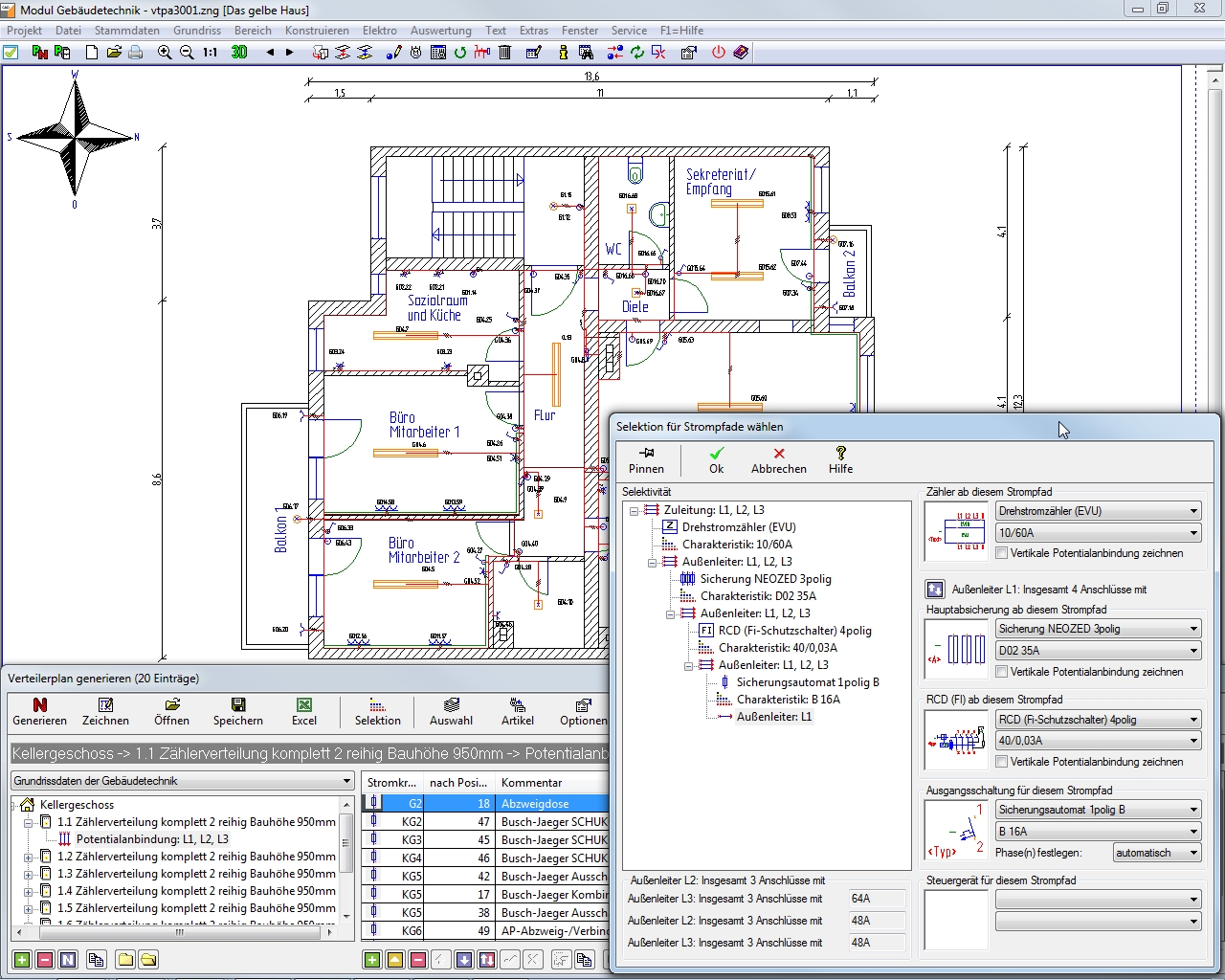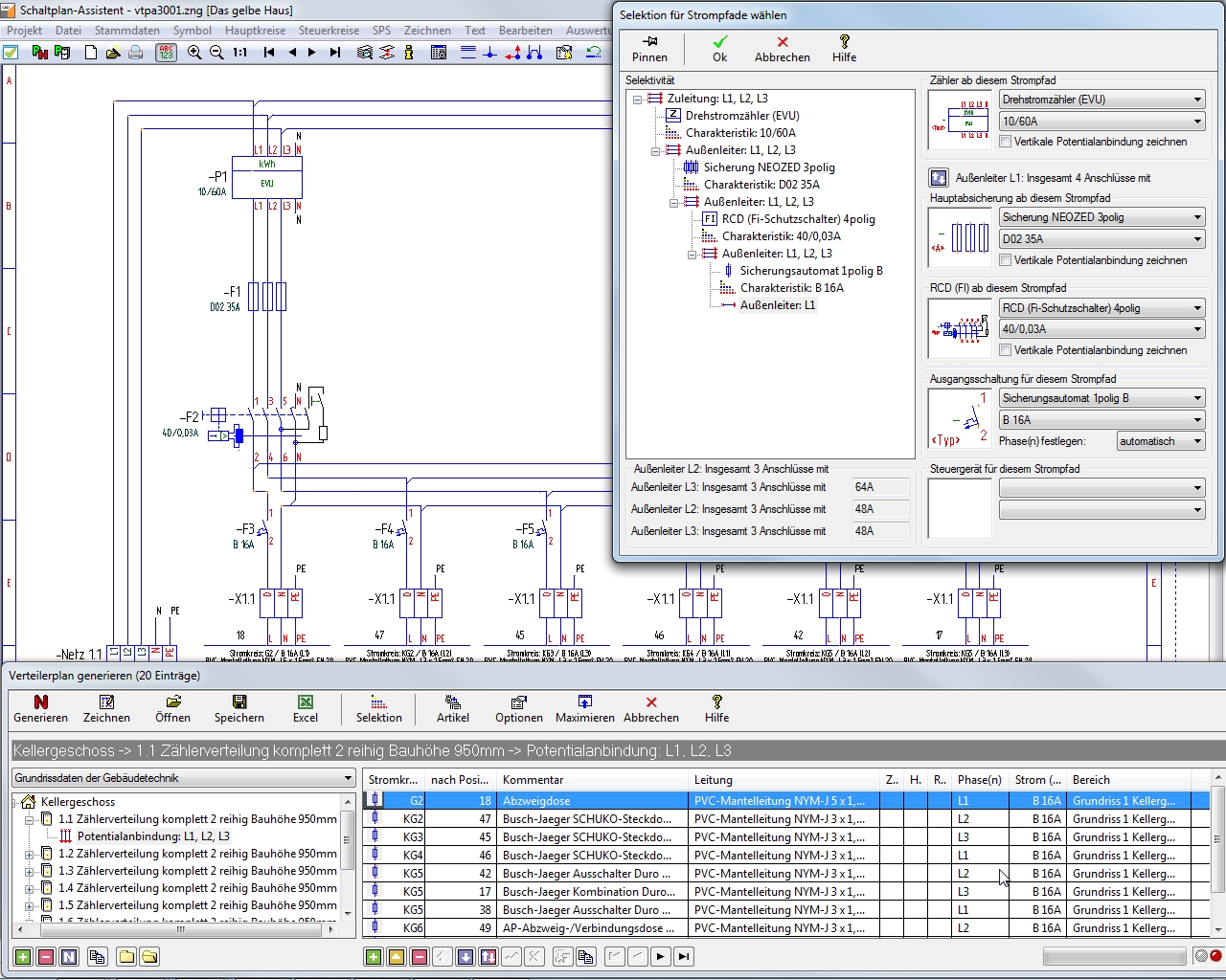 Selbstverständlich kannst du den automatisch über den Verteilerplan-Assistenten generierten Verteilerplan anschließend auch manuell weiter bearbeiten, diesen ergänzen und auch auswerten. Dies erfolgt in dem Schaltplan-Assistententen. Beachte dabei aber bitte, dass manuell vorgenommene Änderungen und Ergänzungen an einem Verteilerplan bei einer eventuellen anschließenden Neugenerierung über den Verteilerplan-Assistenten verloren gehen würden, wenn du die bestehende Datei überschreibst. Standardmäßig legt die Software bei der Erstellung eines Verteilerplanes jedoch immer eine neue Datei, beispielsweise vtpa1002.zng, an.