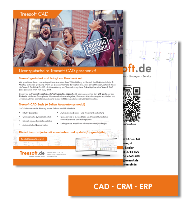 wir gratulieren dir zum erfolgreichen Abschluss deiner Weiterbildung im Bereich der Elektrotechnik (z. B. Meister, Techniker, Studium). Wenn du diesen innerhalb der letzten drei Jahre erreicht hast, schenken wir dir als Unterstützung zur Verwirklichung deiner Zukunftspläne eine Treesoft CAD BASIS Lizenz im Wert von 600,- EUR.
