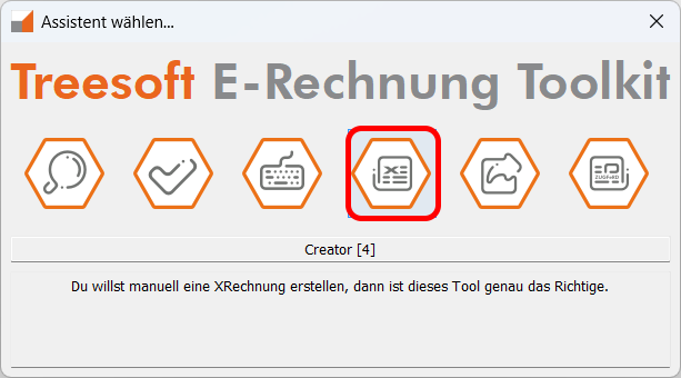 Starte das Treesoft E-Rechnung Toolkit und wähle in der Assistentenauswahl den Creator. Dann siehst du Folgendes:
