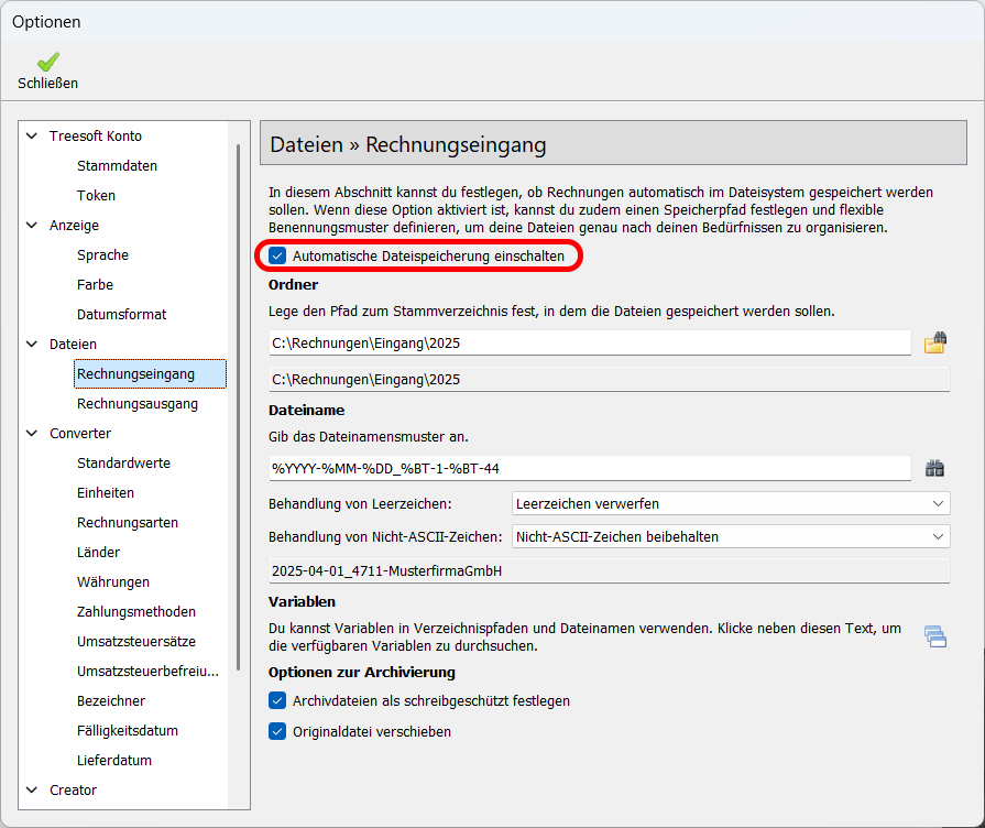 Beim Öffnen einer E-Rechnung greift unser Viewer auf deine individuellen Einstellungen im Optionen-Dialog zu – und verschiebt die Datei automatisch in das gewünschte Verzeichnis. So entsteht ganz nebenbei eine strukturierte, revisionssichere Ablage, die alle Voraussetzungen für eine GoBD-konforme Archivierung erfüllt.