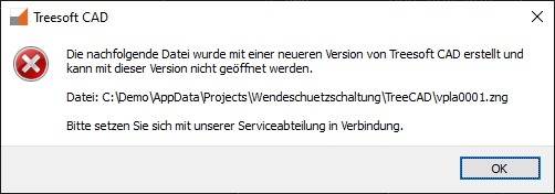 Alle älteren Treesoft CAD Versionen kennen die Kennung nicht und zeigen deshalb die folgende Meldung an: