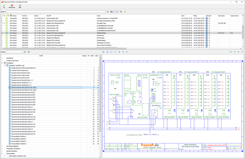 Über den Menübefehl Datei > Öffnen – Navigator werden in einem Dockfenster alle zum Projekt gehörenden Dokumente übersichtlich in einem Verzeichnisbaum angezeigt. Die folgenden Abbildungen zeigen den Dialog Öffnen – Navigator zu einem Projekt aus der Steuerungstechnik, einem Projekt aus der Gebäudetechnik und jeweils mit einer Eingabe im Feld Finden zur Demonstration der Finden-Funktion.