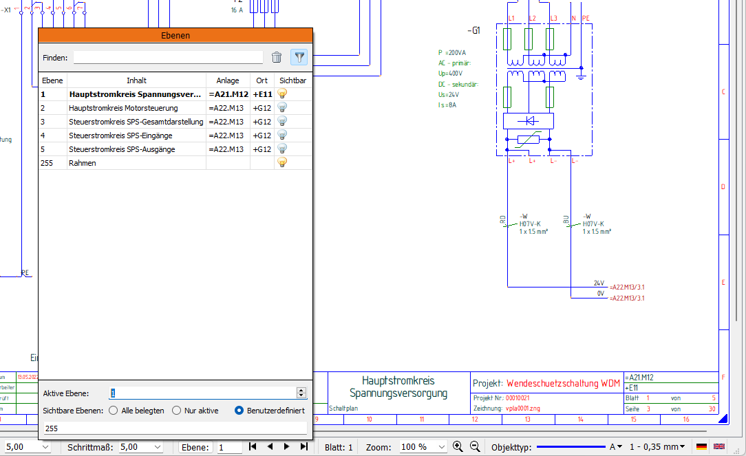 Neben den Schaltflächen zum Blättern in den Schaltplänen steht nun zusätzlich in der Statusleiste auch ein umfangreicher Popup-Dialog Ebenen zur Verfügung. In dem Dialog werden alle Schaltplanseiten eines Dokuments mit den im Zeichnungsrahmen hinterlegten Inhaltsangaben und den ausgelesenen Anlagen- und Orts-Kennzeichen übersichtlich angezeigt. Mit einem Klick auf den gewünschten Eintrag könnt Ihr so schnell und einfach auf die gewünschte Schaltplanseite navigieren.