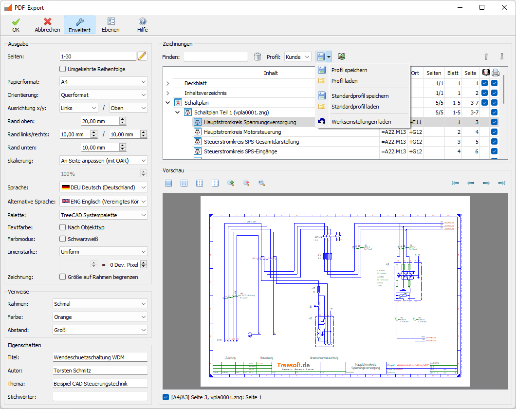 Die Sortierung der Dokumente und was Ihr ausgeben und welche Dokumente eine fortlaufende Seitennummerierung erhalten sollen legt Ihr in den Profilen fest, die Ihr in den Dialogen Projekt Drucken und PDF-Export bearbeiten könnt.