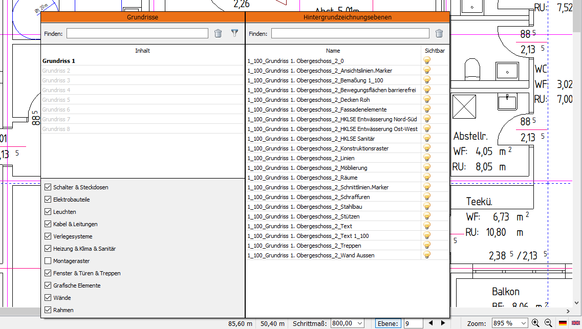 Mit dem Upgrade auf die Version Treesoft Office 7.2 setzt sich das Hintergrundbild im Treesoft CAD auch aus mehren Layern/Ebenen zusammen. Beim konvertieren könnt Ihr jetzt alle Layer mit den Bezeichnungen Eins-zu-eins übernehmen. Über den neu implementierten Pop-up Dialog Ebenen lassen sich im Treesoft CAD Gebäudetechnik diese dann beliebig sichtbar oder unsichtbar schalten.