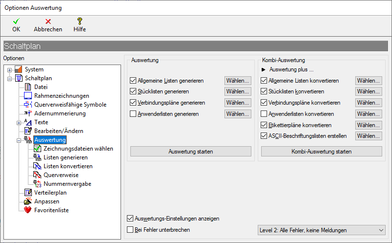 Hat der aufgerufene Zweig Unterzweige, wie beispielsweise Optionen > Schaltplan > Auswertung, dann werden diese automatisch aufgeklappt.