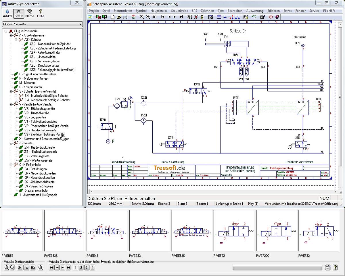 Das Plug-in Pneumatik enthält normgerechte Symbole nach DIN ISO 1219 für deine Dokumentationen in der Fluidtechnik. Treesoft CAD stellt dir hierbei selbstverständlich alle Logikfunktionen und Auswertungsfunktionen für eine einfache und schnelle Erstellung von Pneumatikplänen zur Verfügung. Durch die Autoconnecting-Funktionen werden die Verbindungen deiner Bauteile automatisch erzeugt. Die seitenübergreifende Projektierung von komplexen Anlagen sowie die Querverweiserstellung mit Navigatiosfunktion für verteilt dargestellte Elemente gehören ebenso zum Funktionsumfang, wie die automatische Erstellung von Stücklisten.