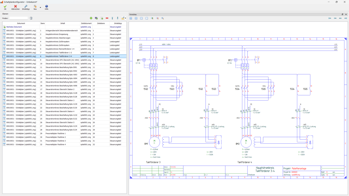 Mit dem Treesoft CAD Schaltplankonfigurator BASIS stehen dir komfortable Funktionen zur projektübergreifenden Auswahl der entsprechenden Schaltplanseiten inklusiver einer Vorschau zur Verfügung. In der Konfiguration kannst du die übernommenen Schaltplanseiten sortieren, wieder löschen oder weitere hinzufügen. Bei der anschließenden automatisierten Erstellung des Schaltplans bildet der Schaltplankonfigurator aus den Betriebsmittelkennzeichnungen symbolische Betriebsmittelkennzeichen.