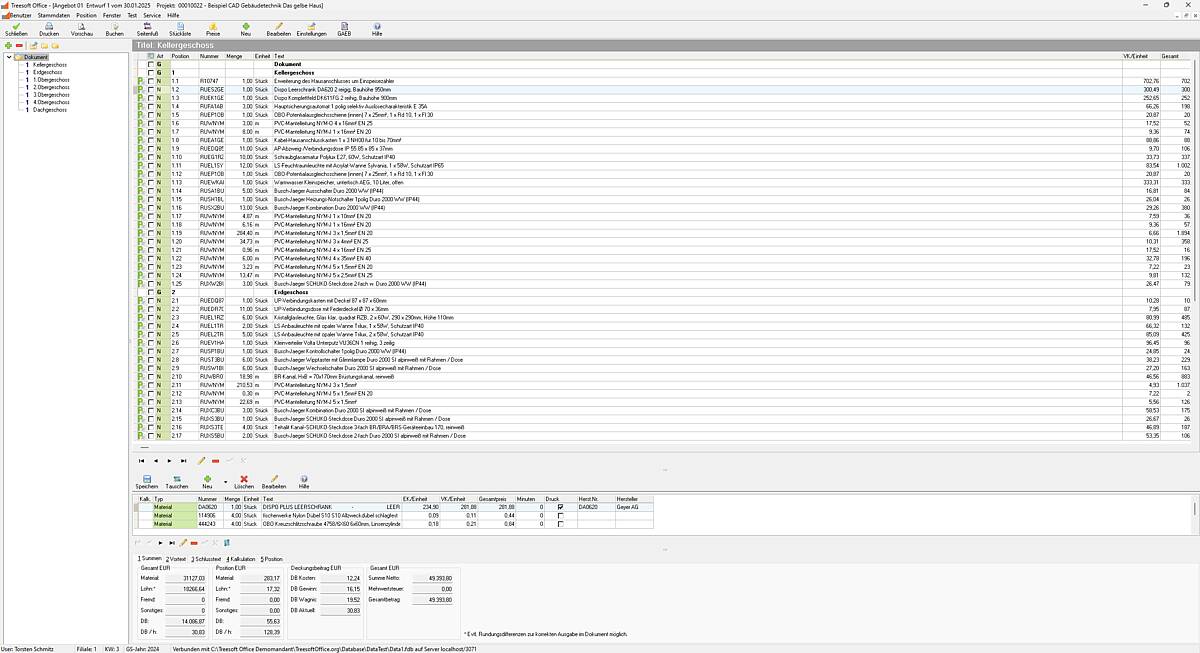 Drei Software-Module auf einer Datenbank: Organisiere deine Unternehmensinformationen in Treesoft Office – vom ersten Kundenkontakt über Elektrocad/CAE-Projektierung bis zur Angebotserstellung und Nachkalkulation.